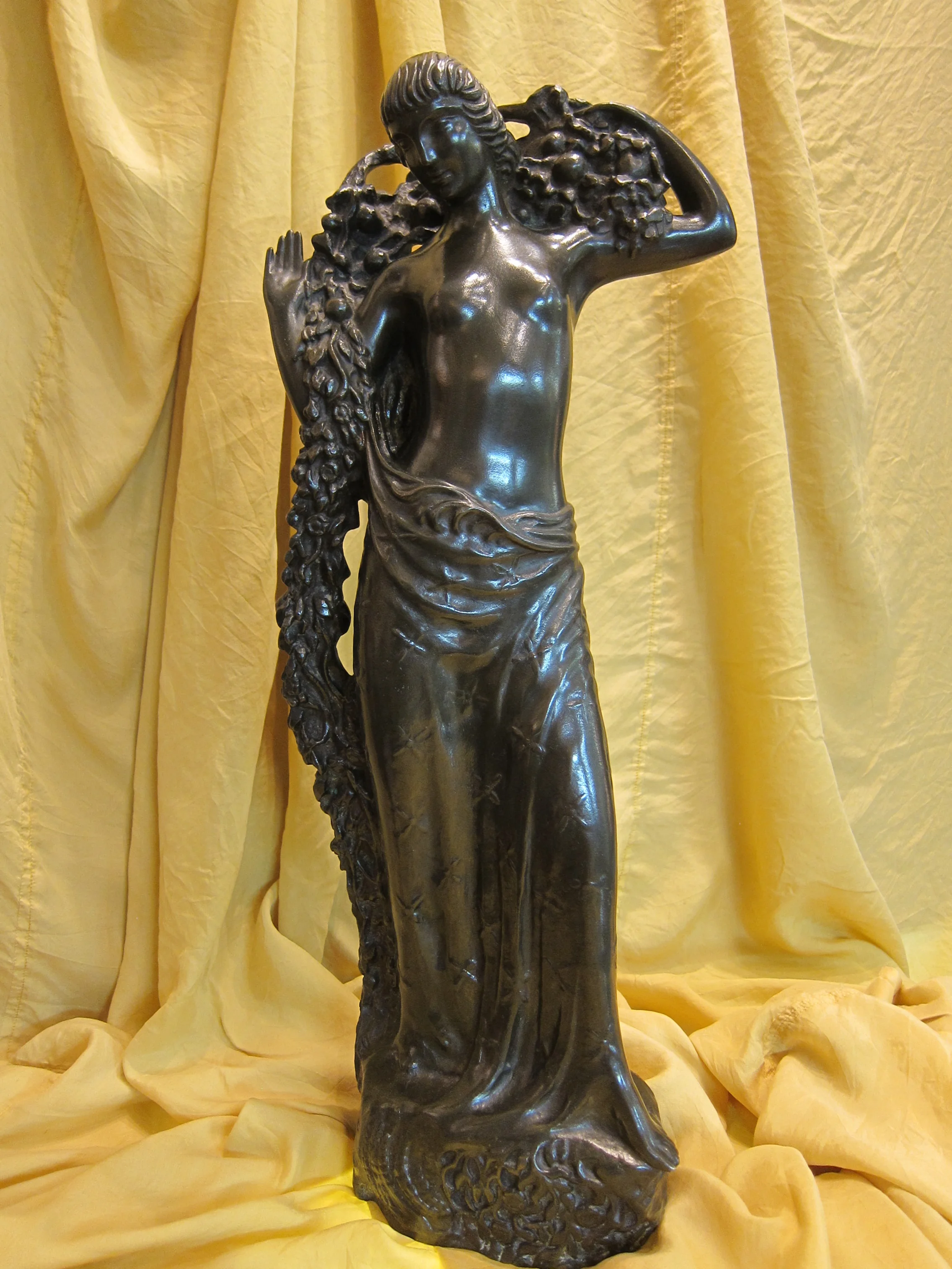 Massive Art Déco sculpture of Pomona, the ancient Roman goddess of fruit trees, garden and orchards, who watches over, protectsand cares for their cultivation. Associated with the flourishing of the fruit trees, in artistic depictions she is generally shown with a platter of fruit or a cornucopia. A statue of Pomona is set atop the Pulitzer Fountain in Manhattan's Grand Army Plaza in New York City.