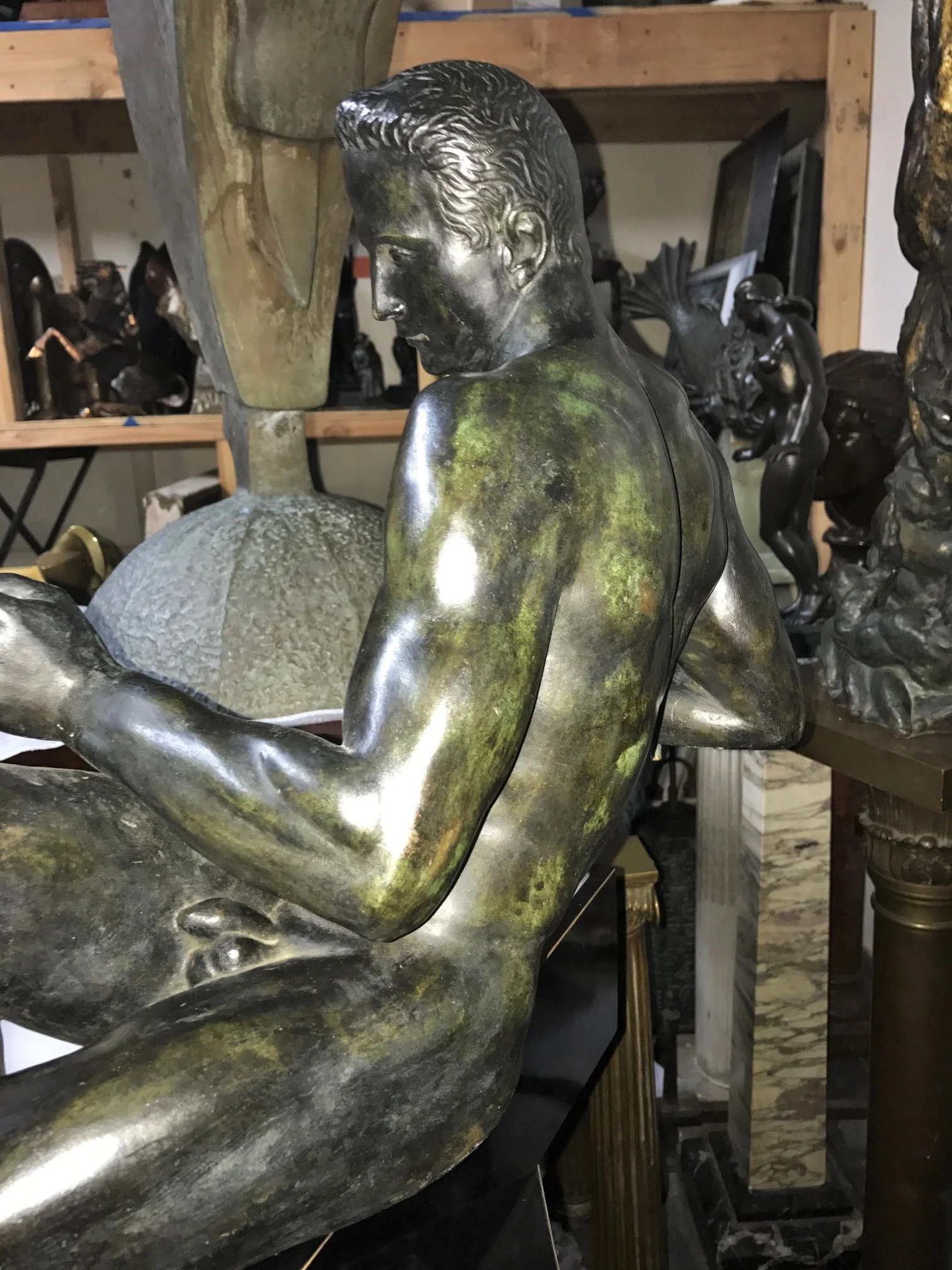 This rare Novecento Italiano Bronze Sculpture of a Reclining Male Nude is a true masterpiece of Art Deco sculpture, created in 1930's Italy. Monumental in its dimensions and weight yet light in perception and elegant, the strong and muscular figure of a reclining nude half-man - half-god is rendered and founderedof bronze with amazing subtlety, and covered with a black and green patina. The fact that the sculptor's name is unknown, gives this extraordinary work of art an even more mystical significance. Created in the best traditions of one of the strongest Italian art movements of the period, Novecento Italiano, this outstanding work of art is following the formal canons of the Art Deco externally, their art is definitely different from the rest because of a certain spiritual content; glorifying the human spirit and the body to the divine ideal; thus creating a new standard of superman - perfect enough not to need any clothes, to decorate or improve himself. On the contrary, his nakedness exalts him above all. Kenneth McKenzie Clark, Baron Clark (1903 –1983), a world-famous British author, museum director, broadcaster, and one of the best-known art historians and aesthetes of his generation, in his book The Nude, published in 1956, puts it with perfection: "To be naked is to be deprived of our clothes and the word implies some of the embarrassment which most of us feel in that condition. The word nude, on the other hand, carries, in educated usage, no uncomfortable overtone. The vague image it projects into the mind is not of a huddled and defenseless body, but of a balanced, prosperous and confident body: the body re-formed."