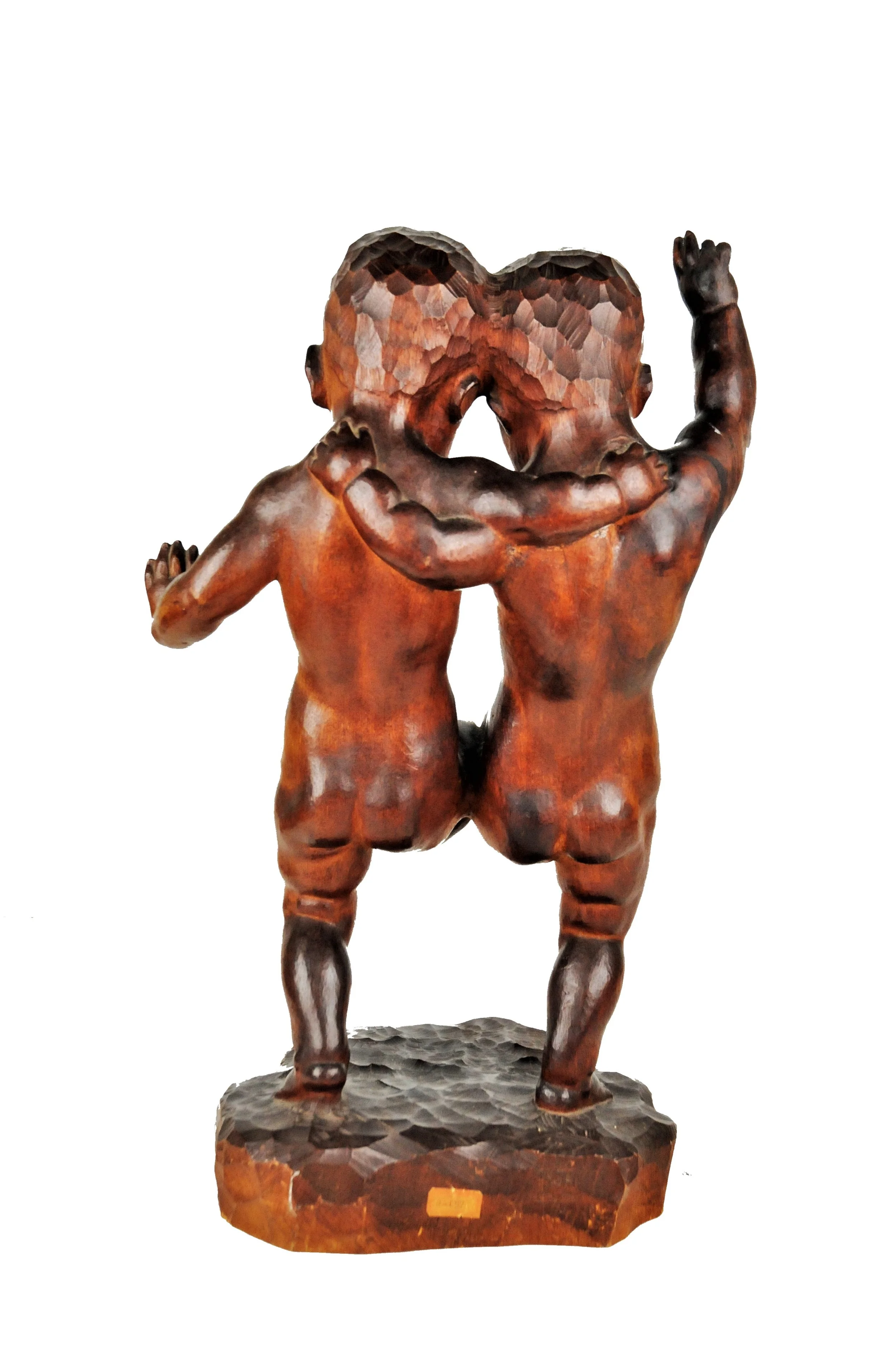 Perhaps German, this wooden sculpture stands as a remarkable masterpiece, showcasing the sculptor’s extraordinary skill and attention to detail. It vividly portrays the anatomical proportions and muscular system of the male body with an exceptional level of accuracy, bringing life and vitality to the figure. The man is captured in a dynamic and dramatic pose, engaged in a fierce battle with a snake, his body twisting and straining with movement, emphasizing both strength and grace. The composition is circular, creating a harmonious flow that guides the viewer's eye around the piece, enhancing the sense of motion and energy. The aesthetic quality of the sculpture is refined and elegant, with every curve and contour thoughtfully crafted to convey beauty and power. The balance between realism and artistic stylization elevates this sculpture beyond mere representation, making it a striking and powerful expression of human and natural conflict.