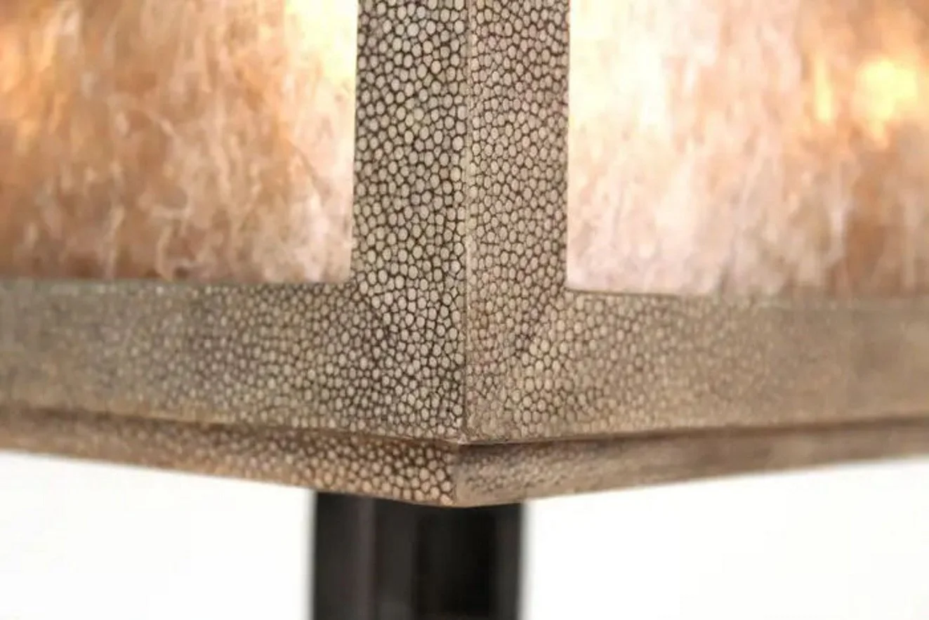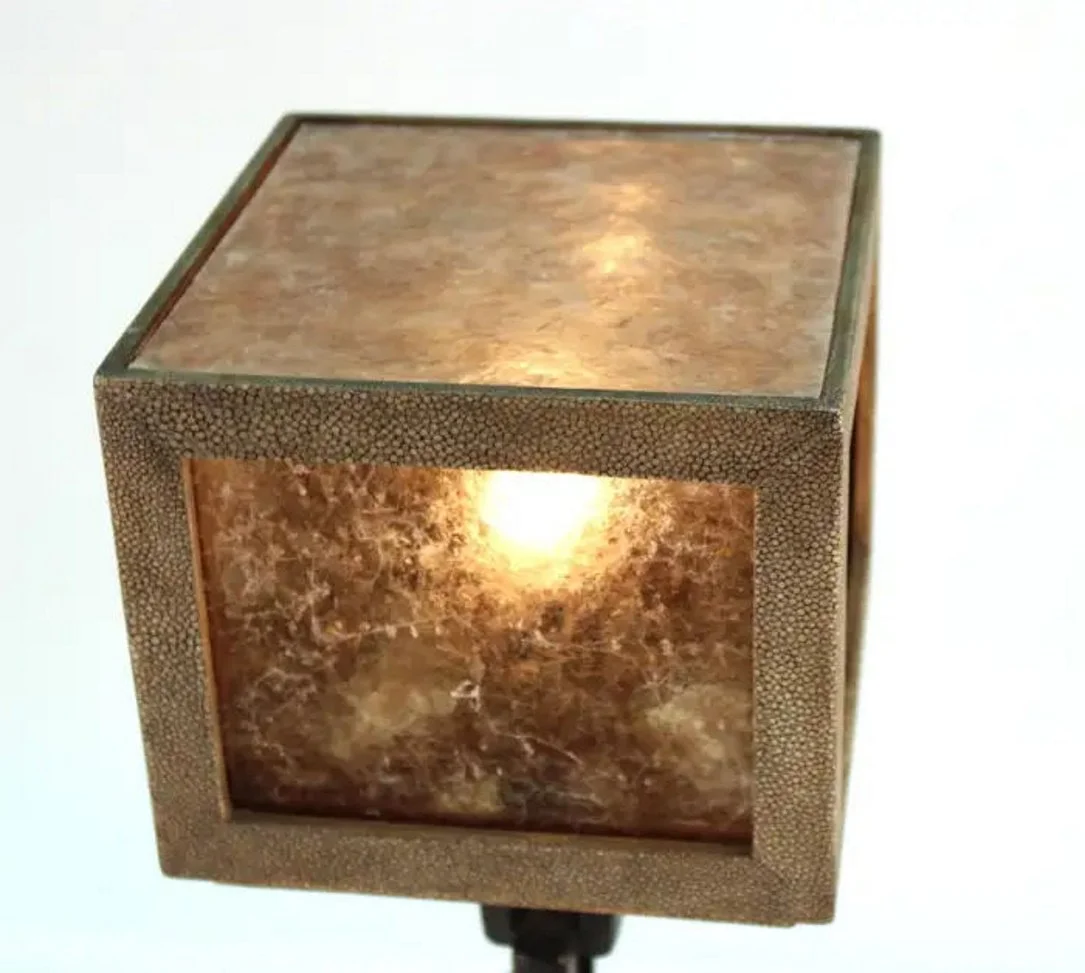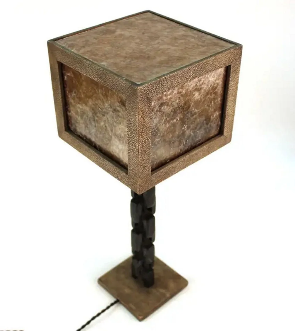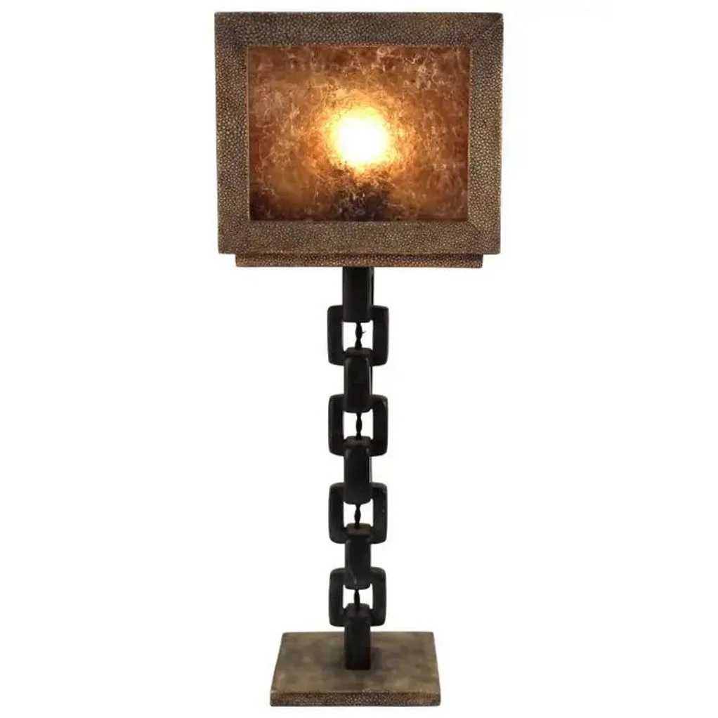 A distinctive Italian Modernist table lamp from the 1960s, showcasing an inventive and sculptural design. The piece features an iron chain-link support rising from a refined shagreen base, creating a compelling contrast between industrial material and luxurious texture. This dynamic structure supports a square shagreen light source, resulting in a harmonious balance of form and material typical of mid-century Italian design. Elegant and visually engaging, the lamp functions as both a source of ambient light and a statement object, ideal for adding character to a desk, side table, or console. Its unique composition reflects the era’s fascination with combining organic and industrial elements in bold, artistic ways. The lamp remains in great vintage condition, exhibiting only minor, age-appropriate wear consistent with its period.