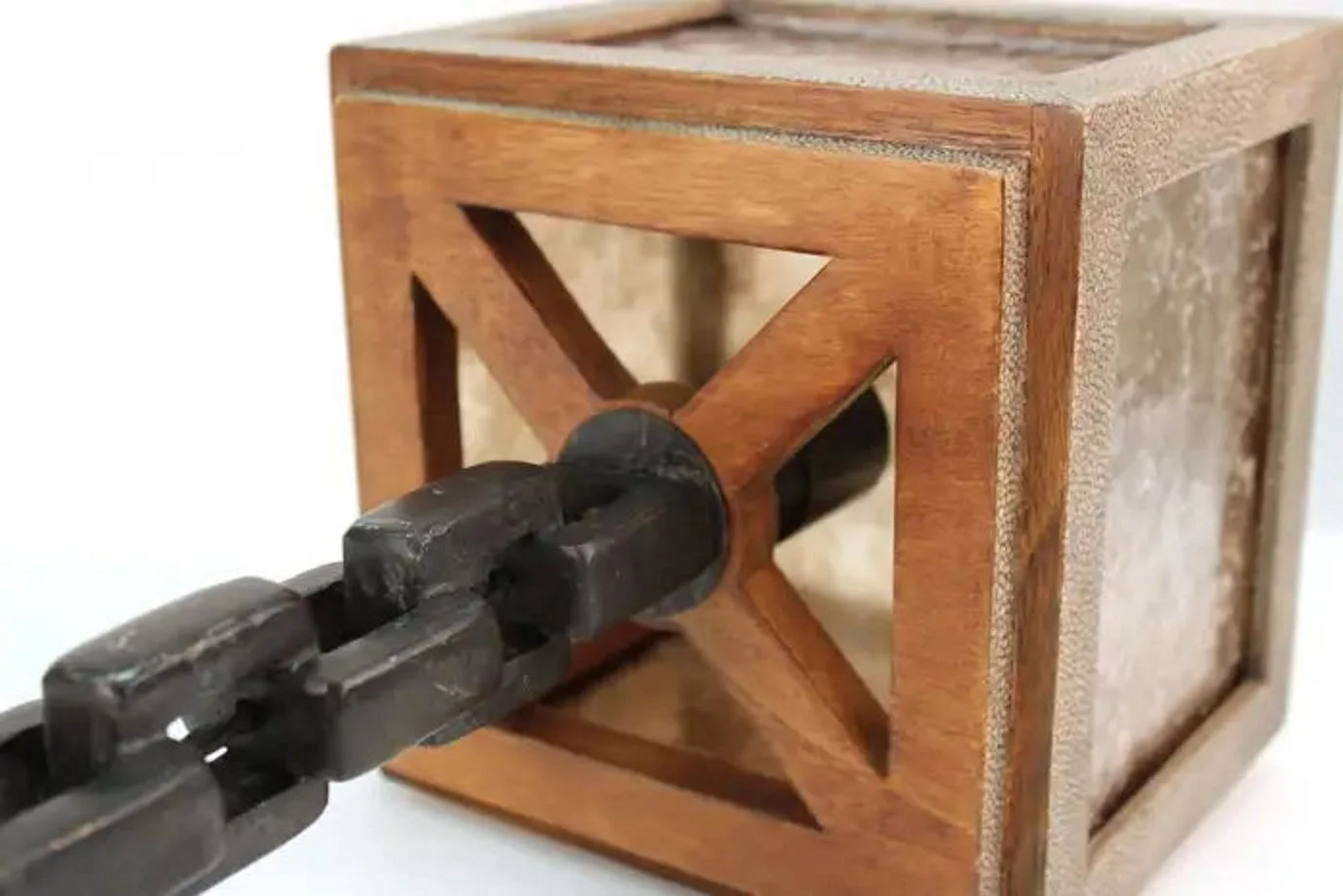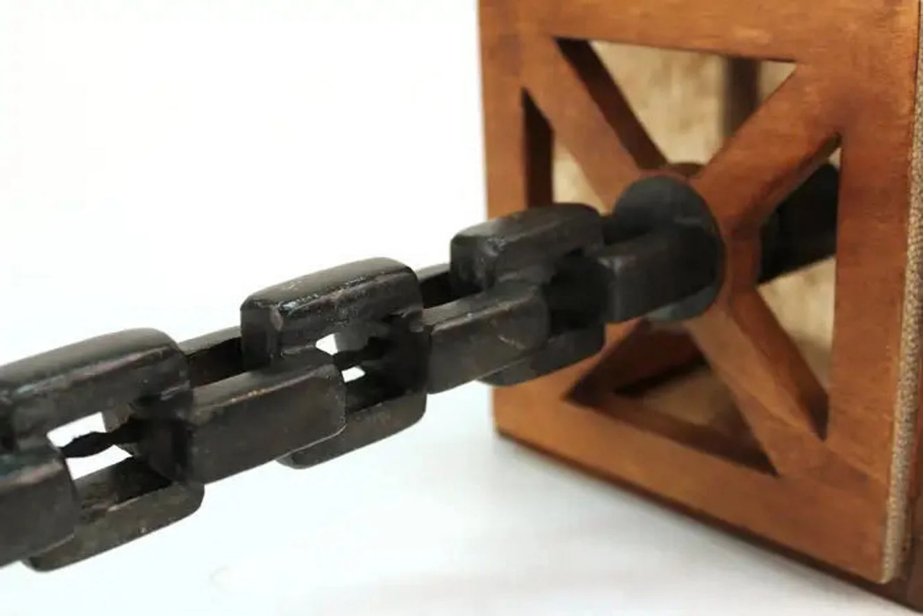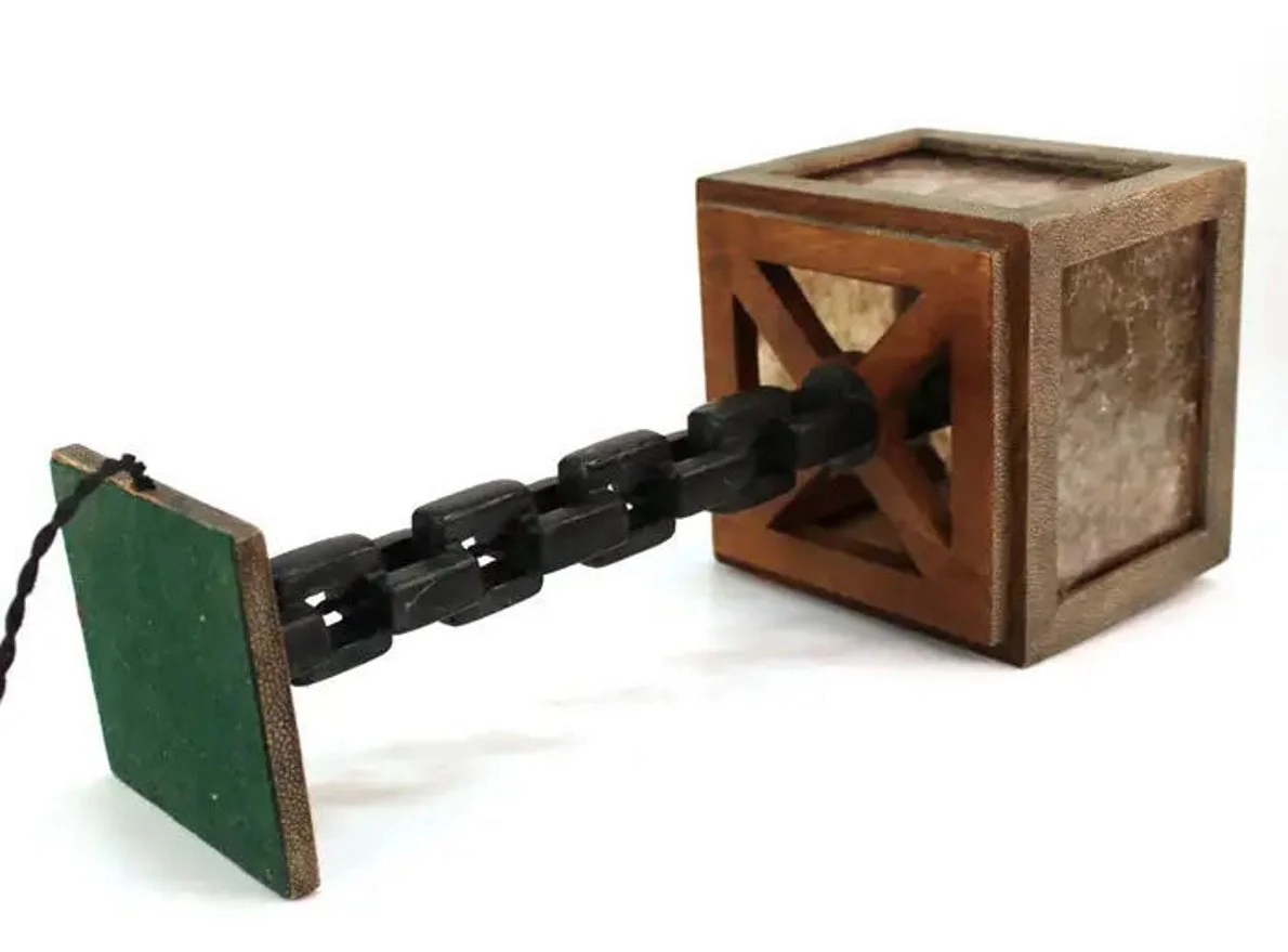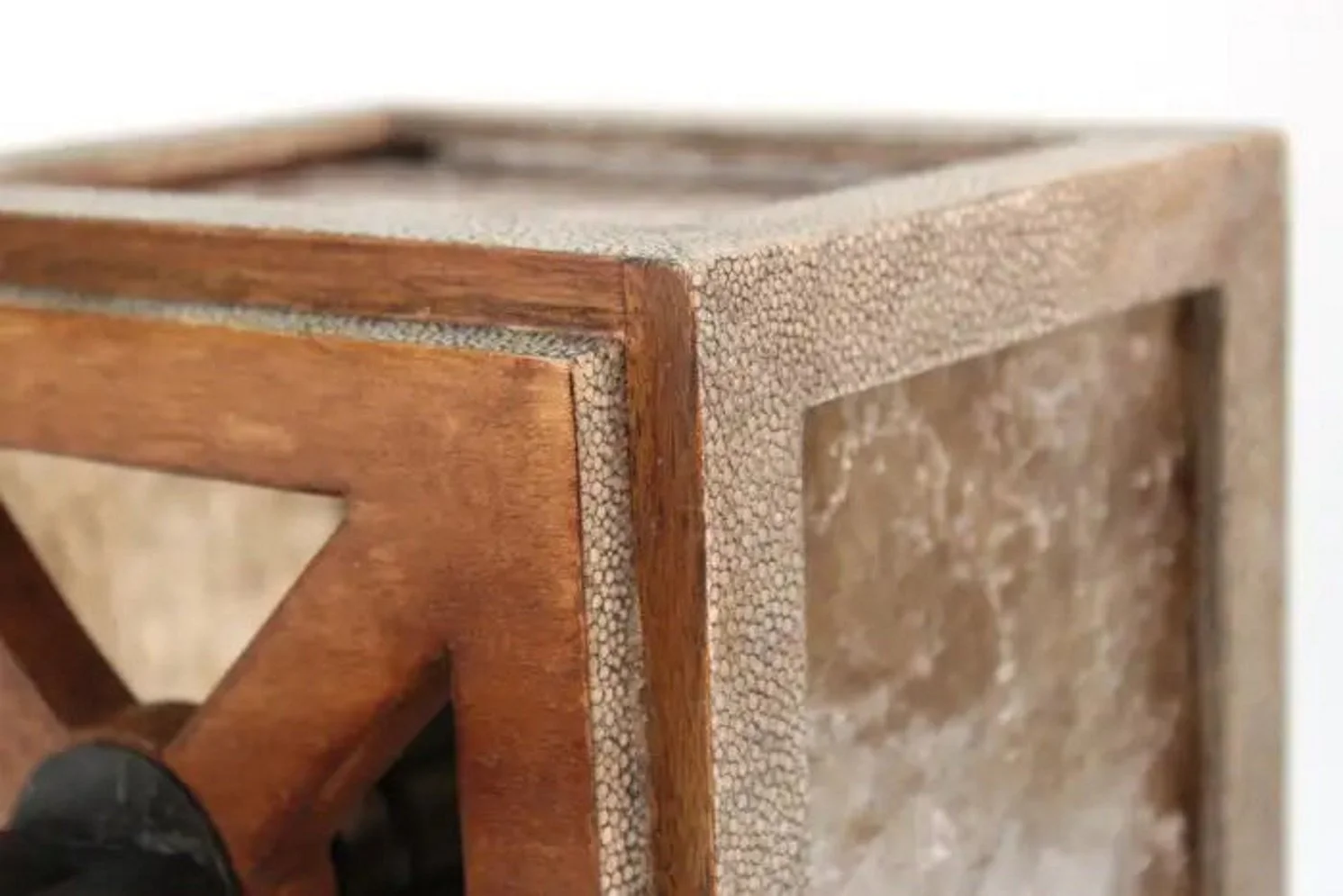 A distinctive Italian Modernist table lamp from the 1960s, showcasing an inventive and sculptural design. The piece features an iron chain-link support rising from a refined shagreen base, creating a compelling contrast between industrial material and luxurious texture. This dynamic structure supports a square shagreen light source, resulting in a harmonious balance of form and material typical of mid-century Italian design. Elegant and visually engaging, the lamp functions as both a source of ambient light and a statement object, ideal for adding character to a desk, side table, or console. Its unique composition reflects the era’s fascination with combining organic and industrial elements in bold, artistic ways. The lamp remains in great vintage condition, exhibiting only minor, age-appropriate wear consistent with its period.