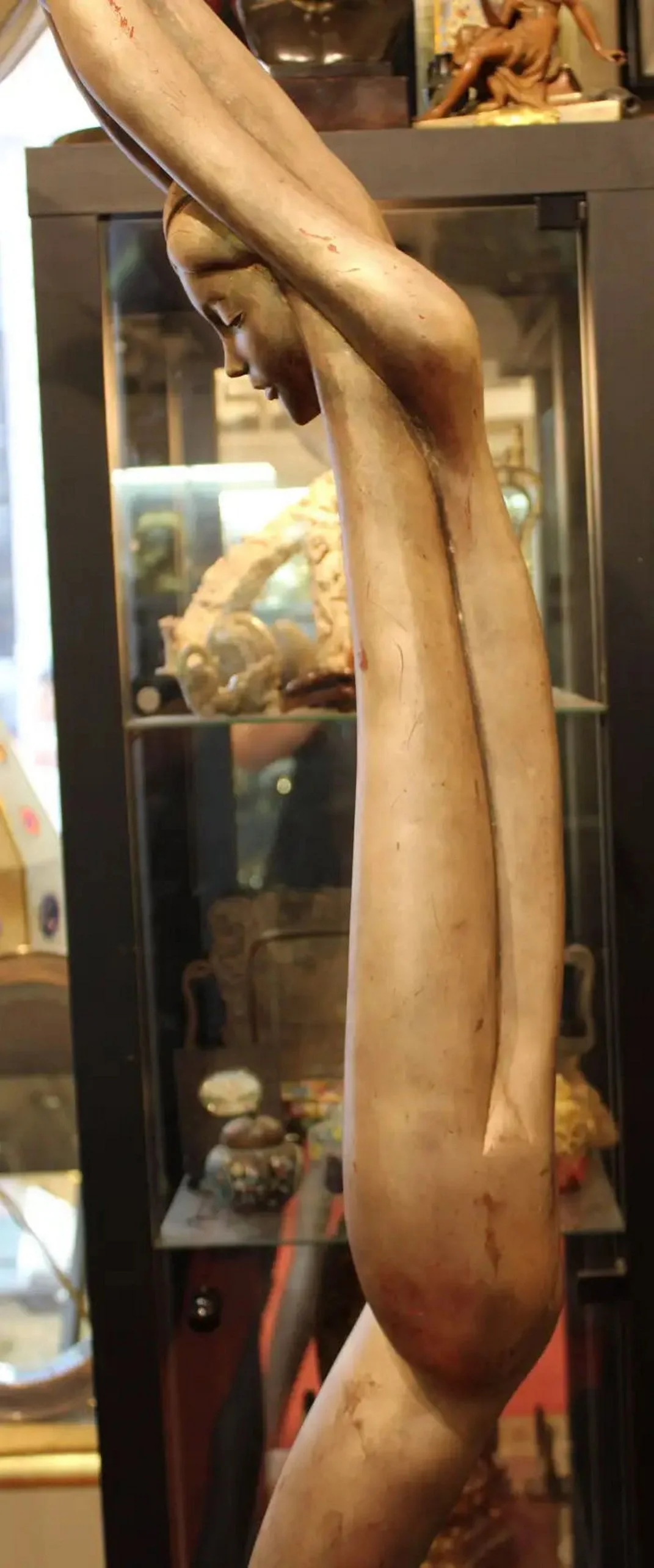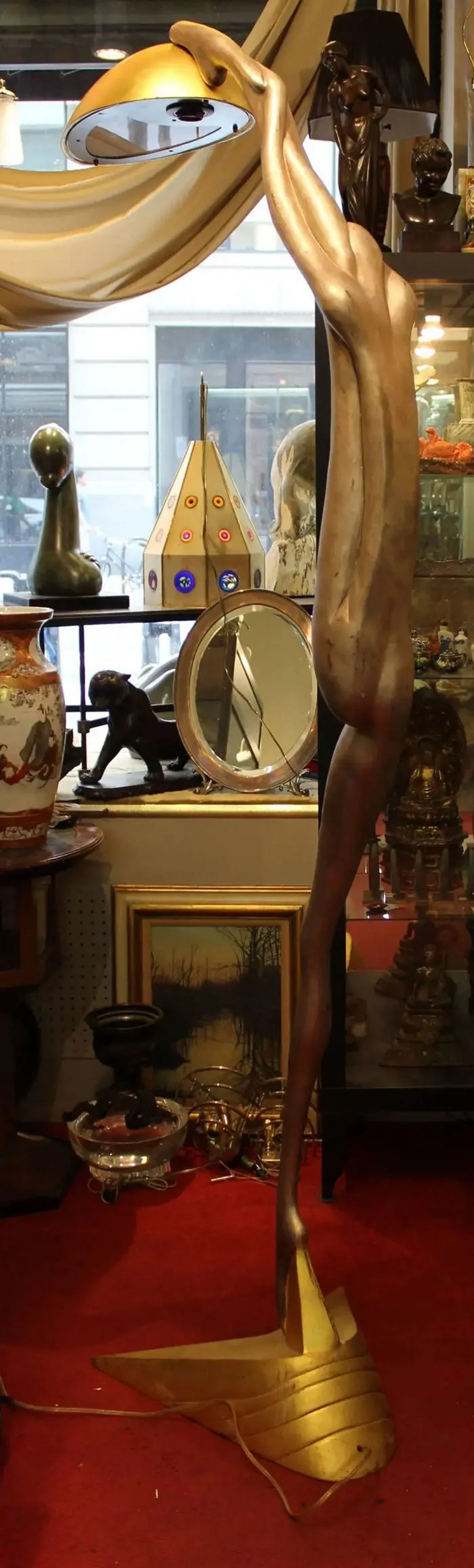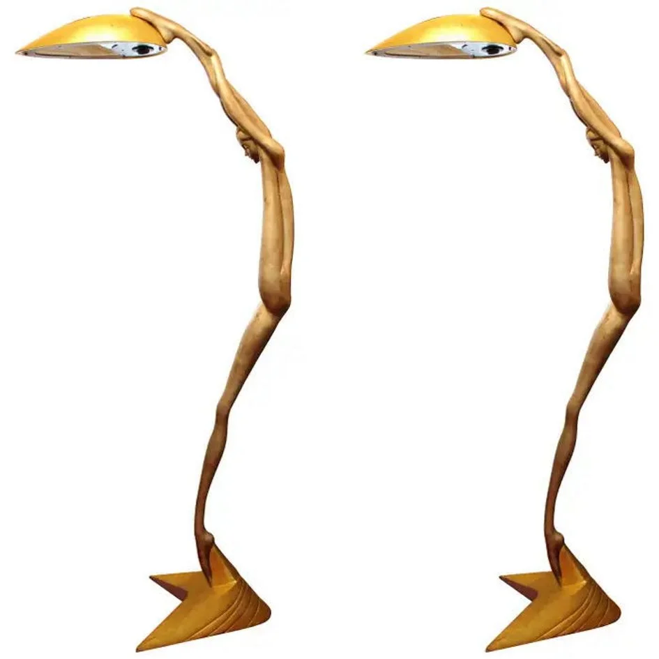 A striking and highly sculptural pair of monumental Art Deco revival floor lamps, each modeled as an allegorical female nude balancing gracefully on one raised leg while extending an arm upward to support the light source. The dramatic, athletic poses evoke the dynamic figurative language of the original 1920s–1930s Art Deco period, recalling the theatrical elegance and modernist sensuality associated with the era.