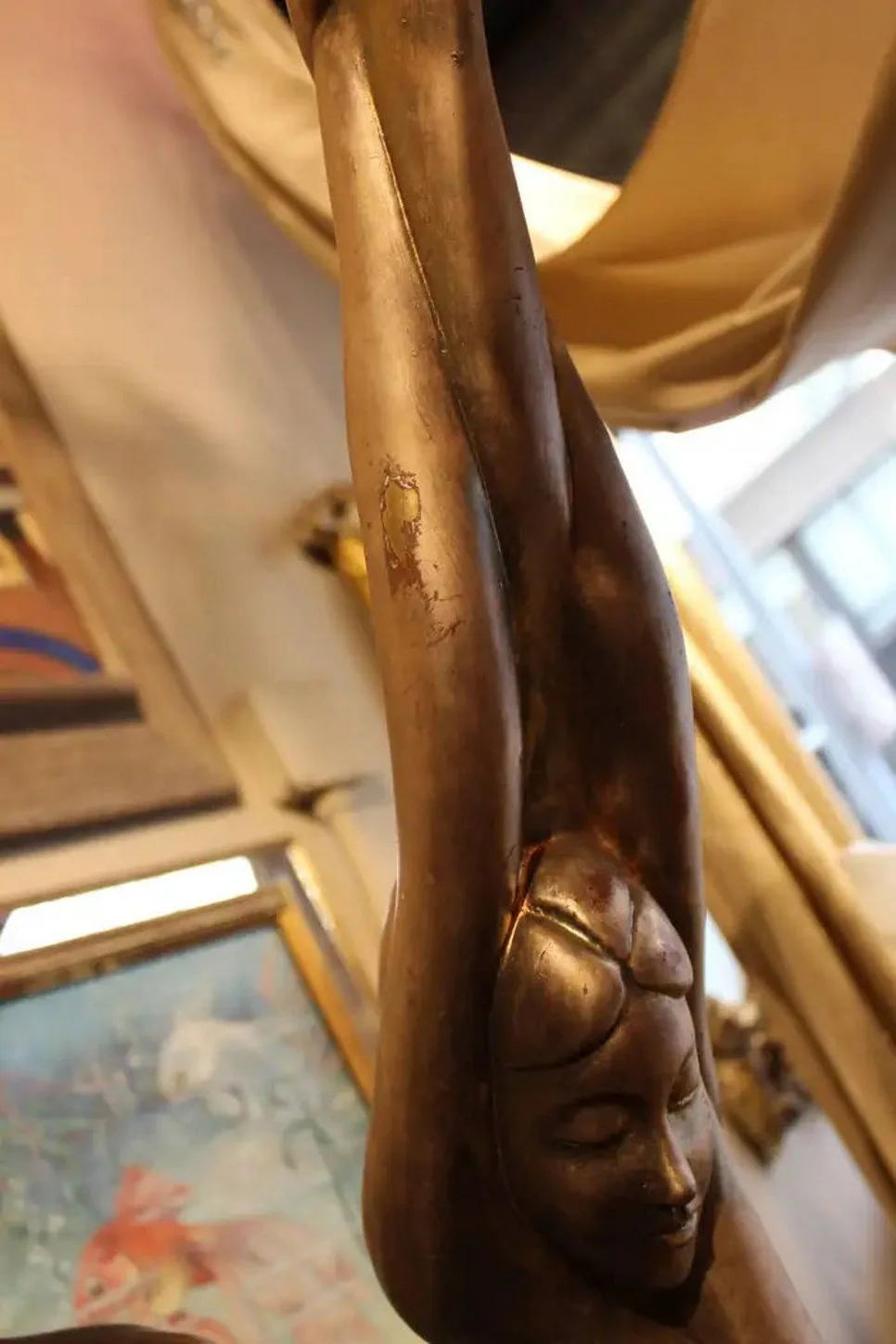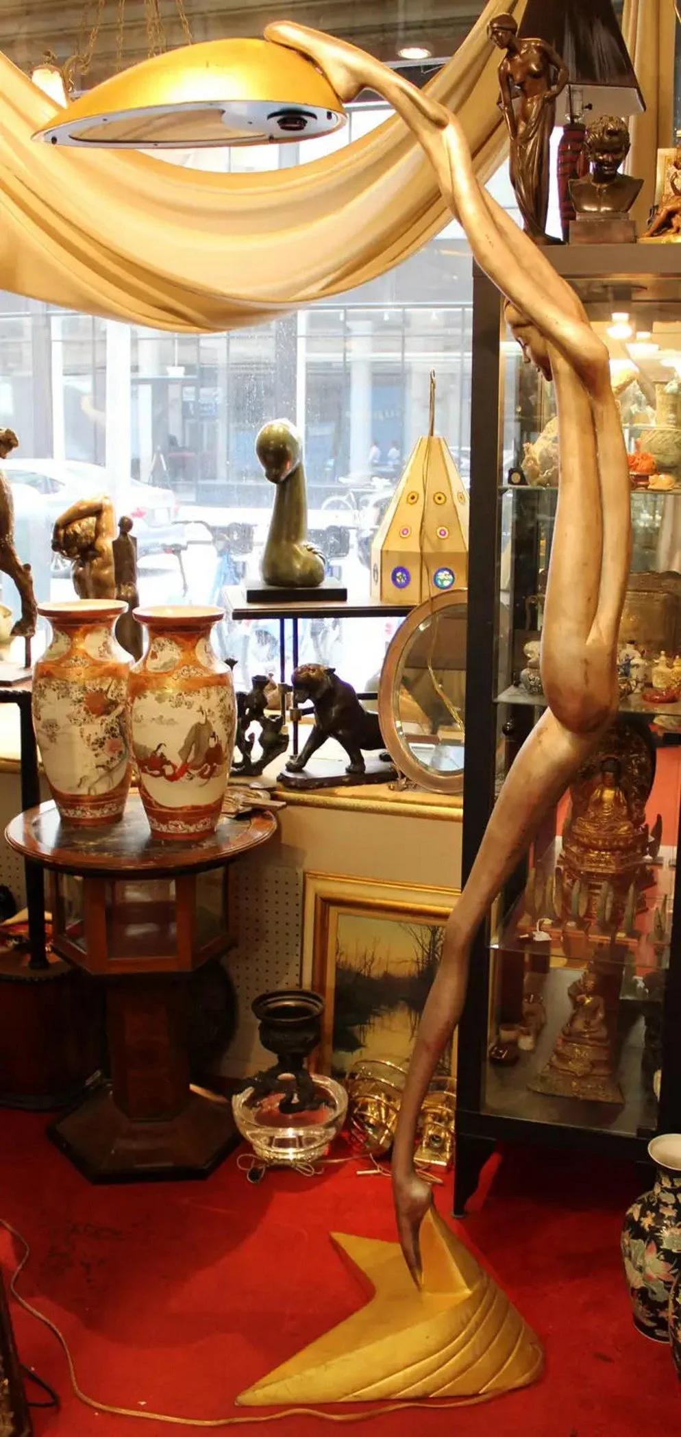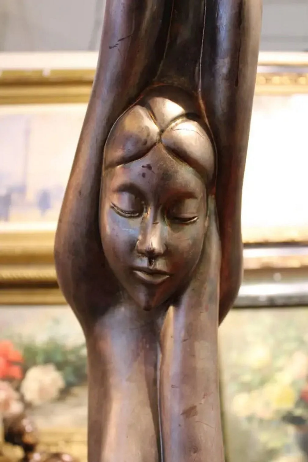 A striking and highly sculptural pair of monumental Art Deco revival floor lamps, each modeled as an allegorical female nude balancing gracefully on one raised leg while extending an arm upward to support the light source. The dramatic, athletic poses evoke the dynamic figurative language of the original 1920s–1930s Art Deco period, recalling the theatrical elegance and modernist sensuality associated with the era.