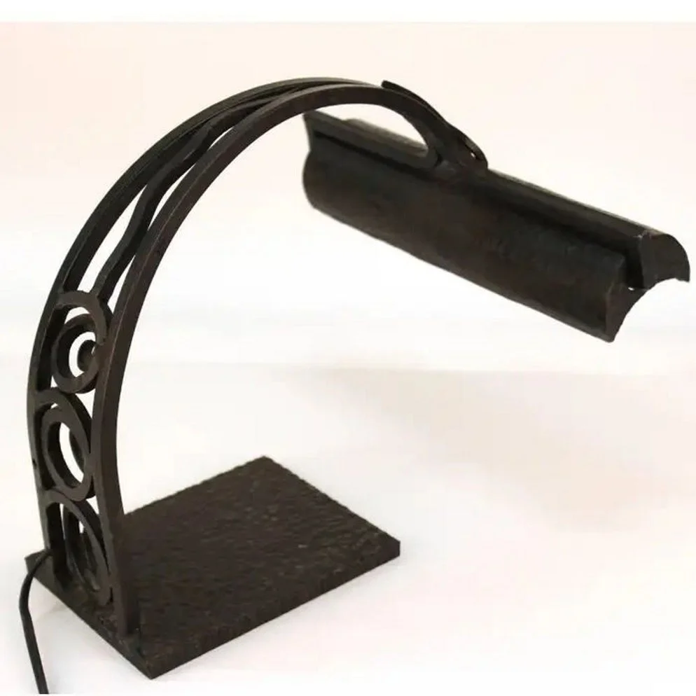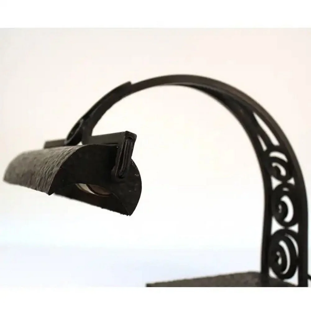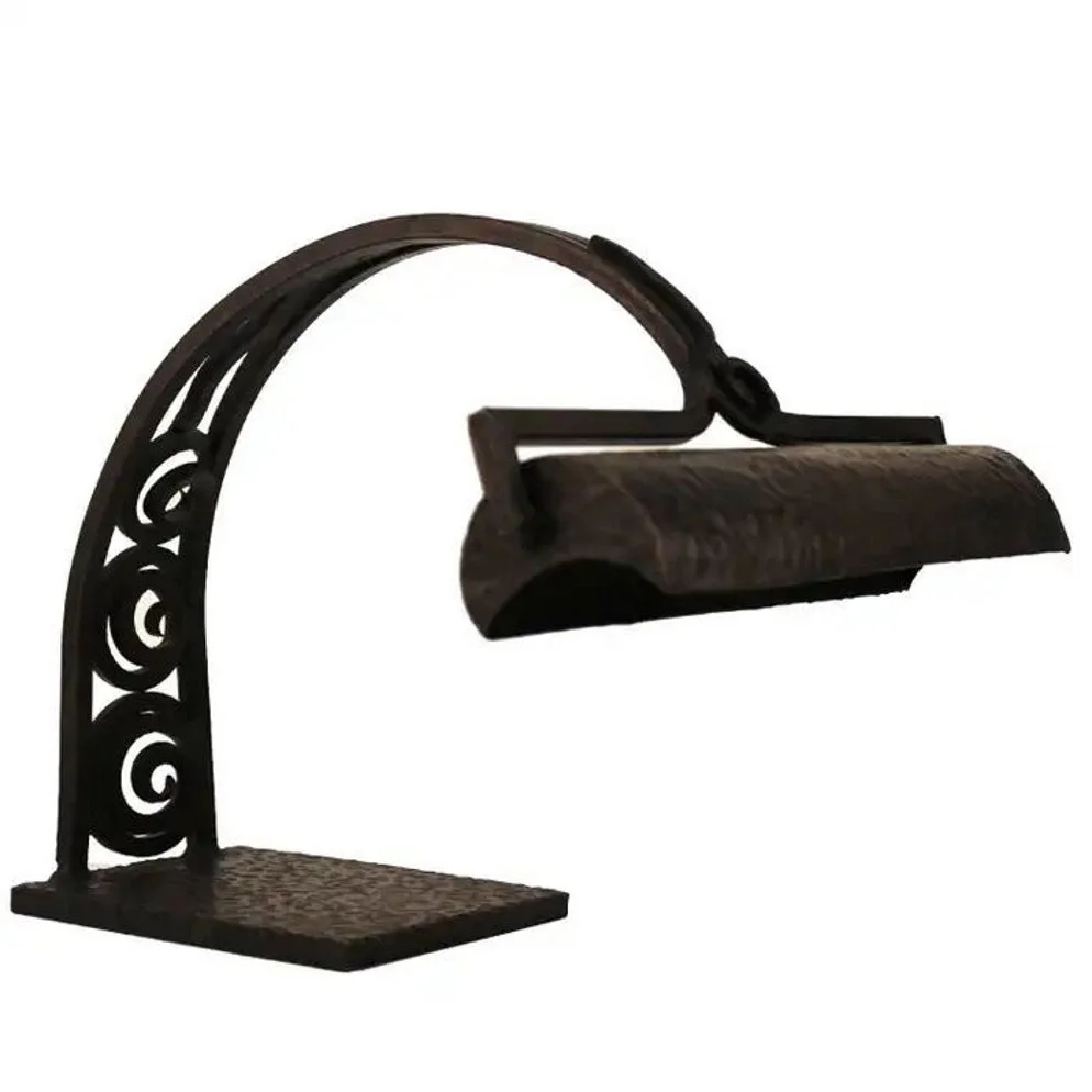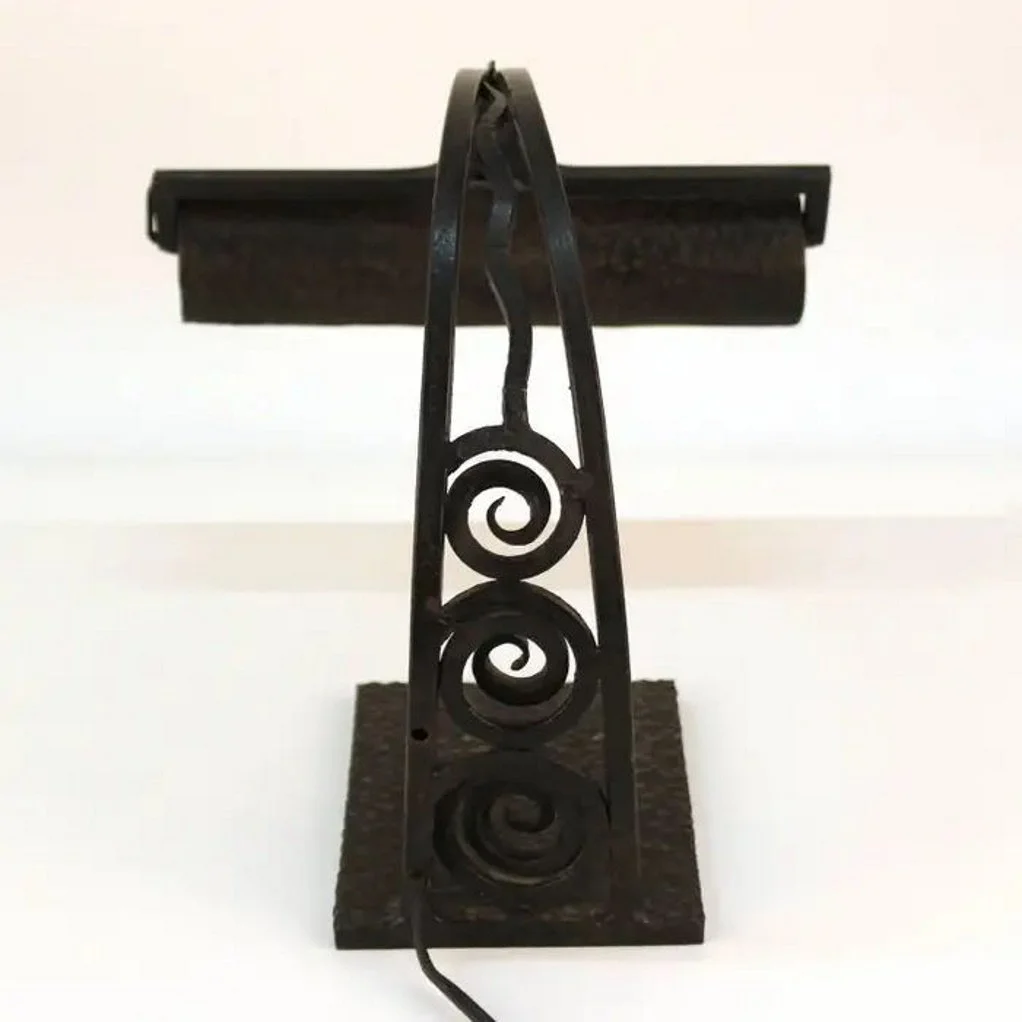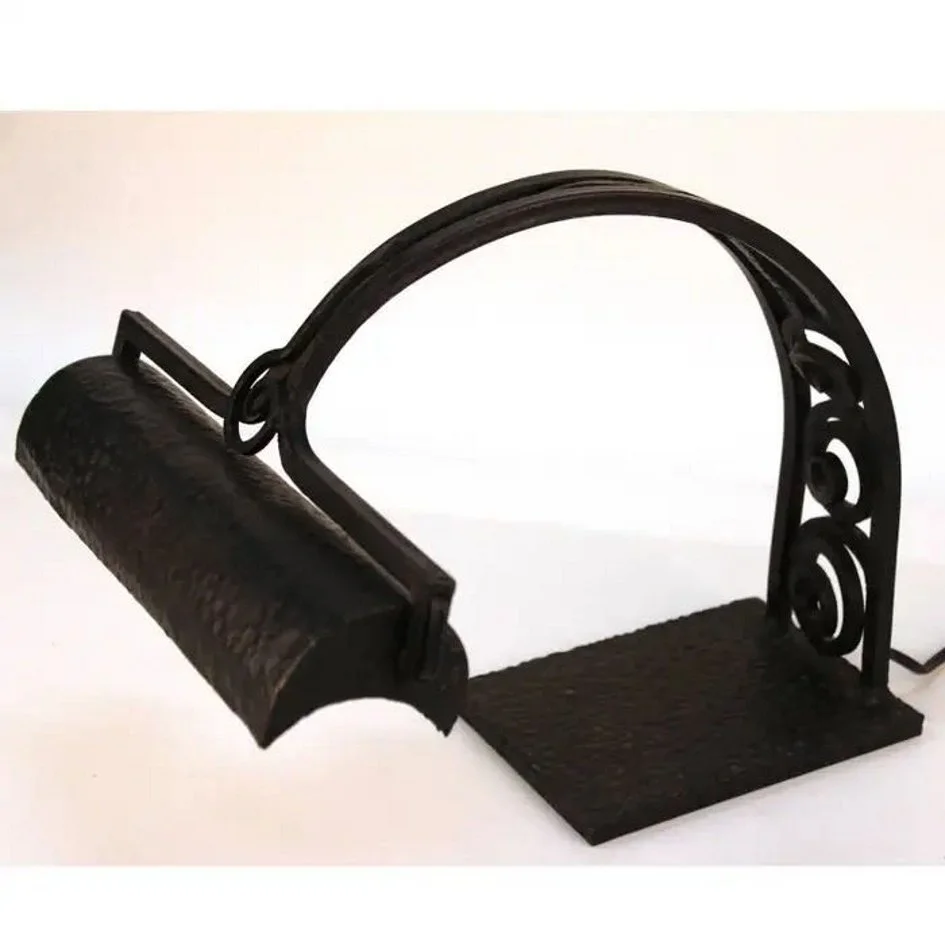 The adjustable metal shade allows the direction of light to be easily controlled, making the lamp especially suitable for use on a piano, desk, or reading table. The hand-forged wrought iron construction gives the piece both durability and sculptural presence, while its restrained design reflects the sophisticated modernism of French decorative arts during the interwar years.