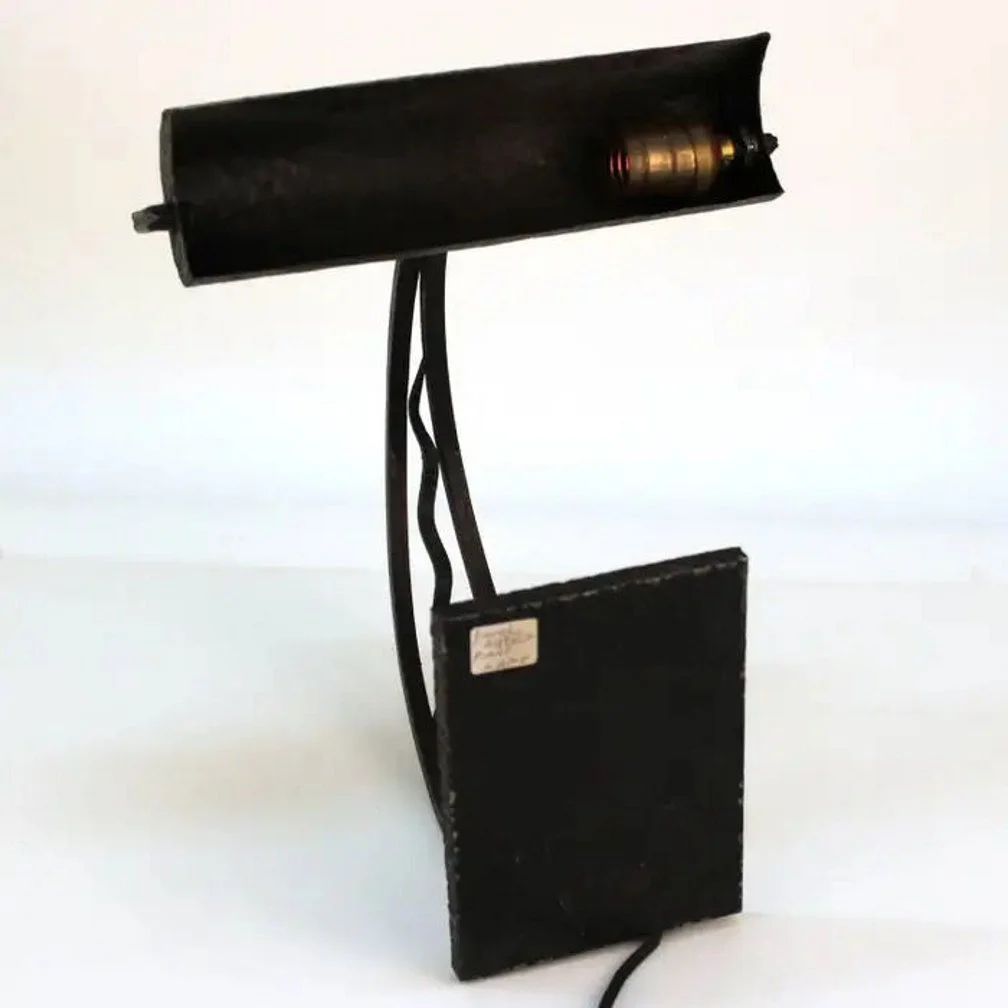 A striking Brutalist table lamp crafted in wrought iron, evocative of the sculptural aesthetic of Paul Evans. The bold, textural design features a geometric and abstract forged form, characteristic of Evans’ distinctive approach to metalwork. This lamp takes a single tubular bulb and has been newly rewired for contemporary use. In good vintage condition, the surface displays an appealing, age-appropriate patina and minor wear consistent with its age, enhancing its raw and industrial charm. A sculptural lighting piece that blurs the line between functional design and expressive art.