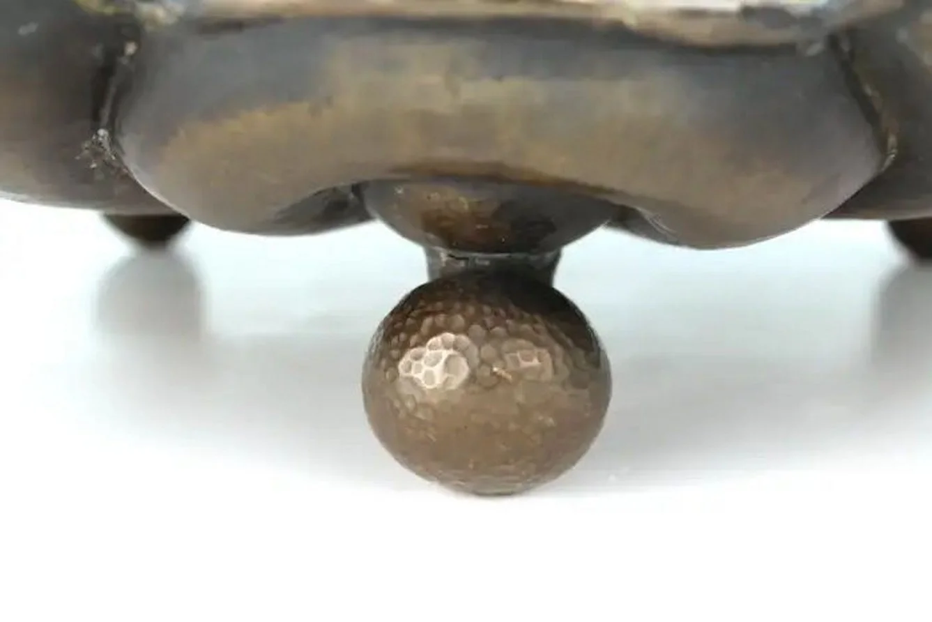 This beautiful terracotta-color lacquered brass jewelry tray with bronze handle in the form of a leaf is tastefully decorated with a patinated bronze handle in form of a branch and miniature turtle and a fly. Unmarked.